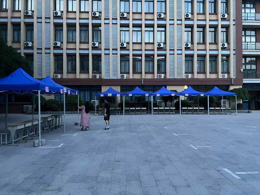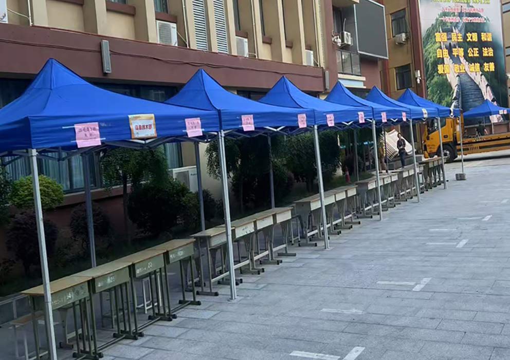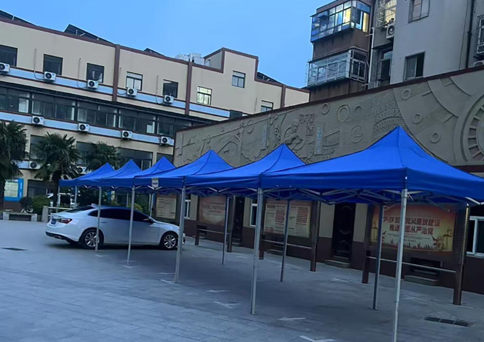 鄭州科技工業(yè)學(xué)校的校園里,幾頂藍(lán)色折疊帳篷在陽(yáng)光下泛著沉穩(wěn)的光澤。這是鄭州篷房出租公司為校園活動(dòng)布下的臨時(shí)空間,靛藍(lán)色的篷布與周圍的綠樹、紅磚教學(xué)樓形成鮮明對(duì)比,卻又以恰到好處的尺度融入校園環(huán)境,為師生們提供著一片可遮陽(yáng)避雨的實(shí)用角落。