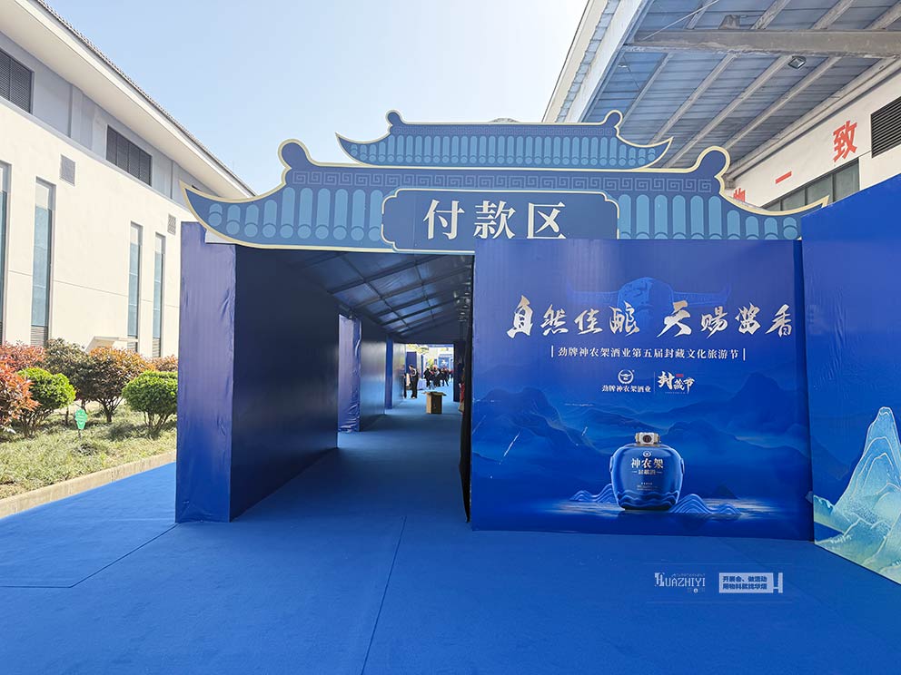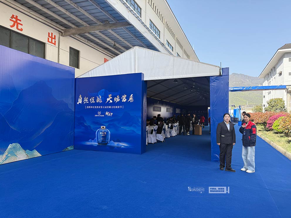 定制款藍(lán)色篷房成為活動現(xiàn)場的亮眼標(biāo)識,色調(diào)清新雅致,與神農(nóng)架的青山綠水相映成趣,既呼應(yīng)了勁牌神農(nóng)架酒業(yè)的生態(tài)理念,又兼具實用功能。篷房采用高強(qiáng)度框架與優(yōu)質(zhì)篷布,防曬防水、穩(wěn)固耐用,可靈活劃分封藏儀式區(qū)、休憩區(qū)、展示區(qū),為各項活動的順利開展提供可靠空間保障,同時成為現(xiàn)場打卡取景的熱門場景。